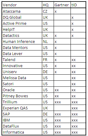 Three smaller vendors are considered by Gartner, but not by The Information Difference and vice versa. Two midsize vendors are included by The Information Difference, but not by Gartner. Experian QAS are included as a big one by The Information Difference, but did not (yet) meet the inclusion criteria used by Gartner.