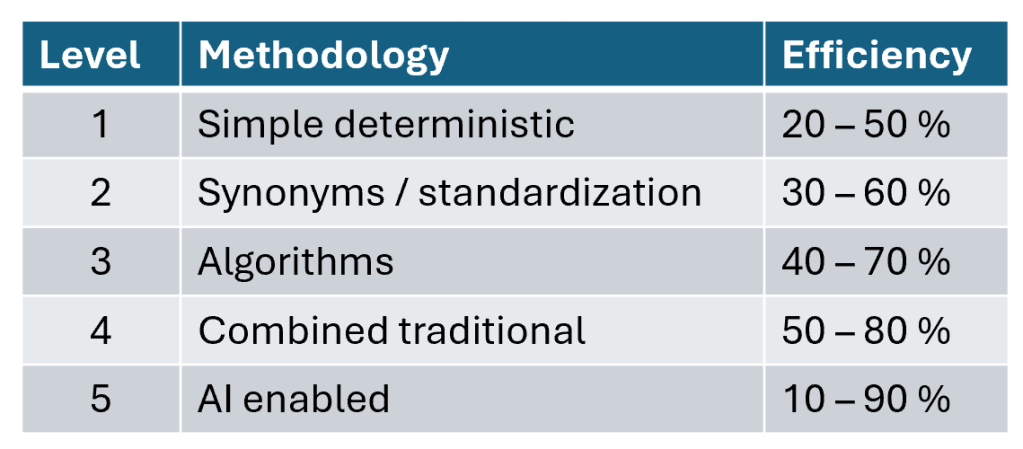 Over the years there have been developed numerous tools and embedded capabilities to tackle the data matching challenge. Some solutions focus on party (customer/supplier) master data and some solutions focus on product master data. Within party master data many solutions focus on person master data. Many solutions are optimized for a given geography or a few major geographies.
