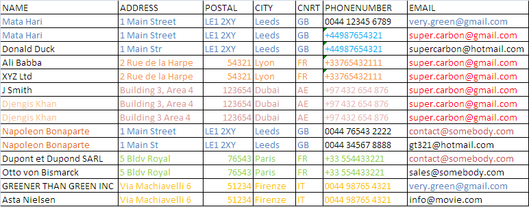 Here we have an example of a group of entities where the name, address, e-mail or phone is shared in a way that doesn’t seem natural.